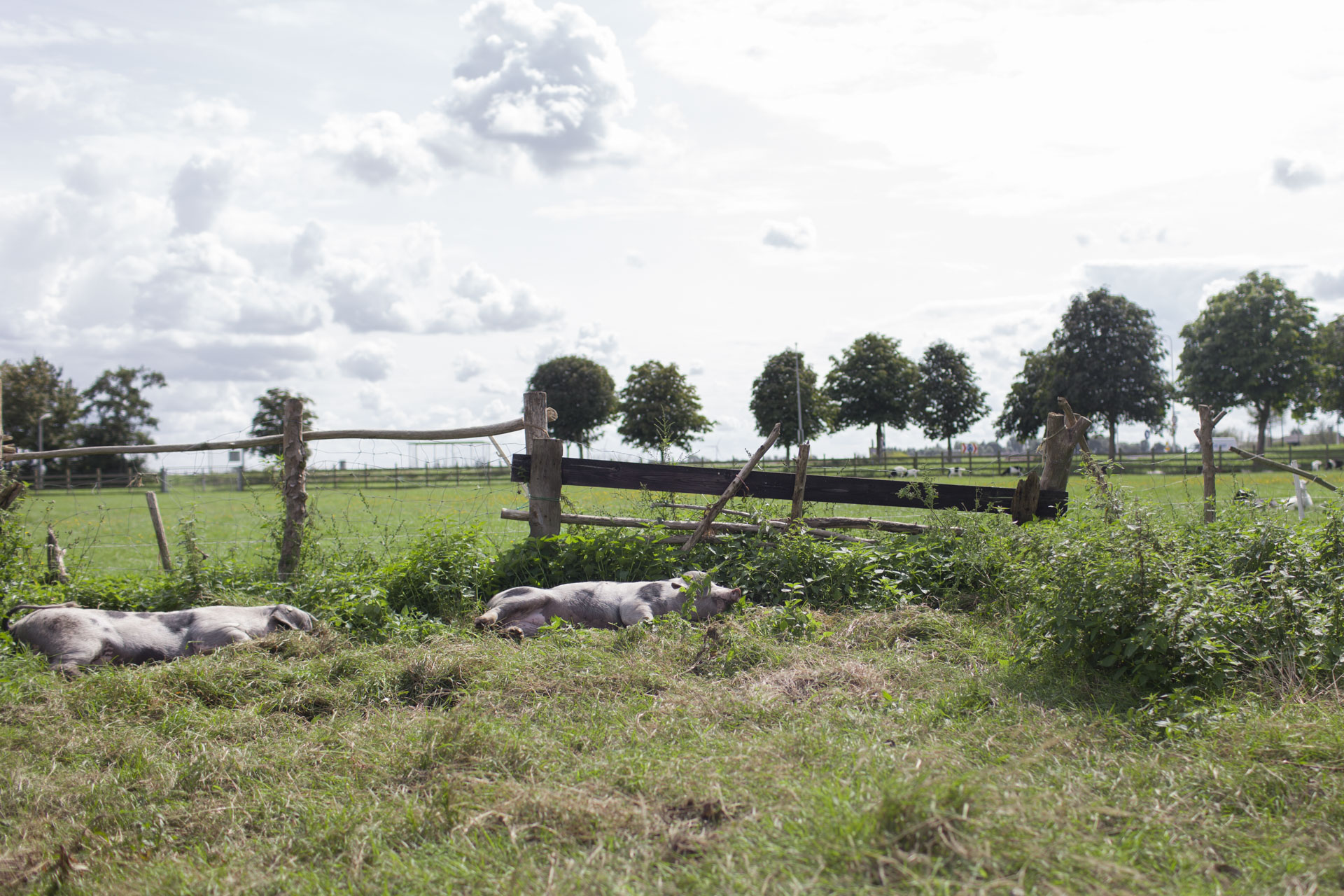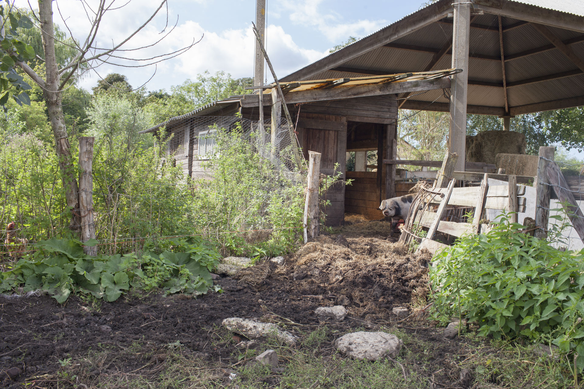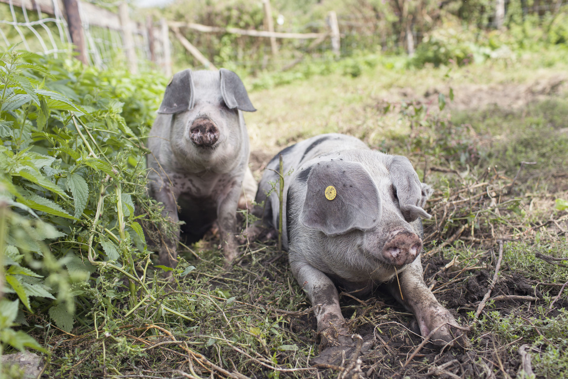 Op de boerderij scharrelt ook een groepje varkens, vrijwel nooit meer dan vier, op die manier blijft alles op de boerderij in balans. De varkens worden gevoerd met eigen geplet graan, val appels/peren uit het voedselbos en kaaswei. Kaaswei is een restproduct uit de kaasmakerij van de boerderij, het bevat hoogwaardige eiwitten en de varkens zijn er gek op.