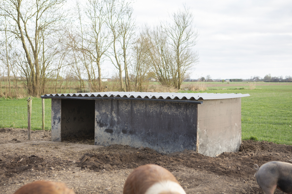 Ze koopt de biggen aan van soortgelijke varkenshouders, deze zijn al gewend aan het buitenleven, de rassen waarop ze selecteert (Husumer/Duroc/Bonte Bentheimer) kunnen goed tegen de Hollandse weersomstandigheden. Afgelopen winter werd het buiten in de wei toch te nat voor de varkens, gelukkig had Renate de mogelijkheid om ze onder te brengen in een overdekte potstal, die aan de zijkanten open was. Voor veel buitenvarkenshouders is extreem weer, zoals lange natte periodes een probleem. Een overdekte stal biedt in deze maanden een geschikte oplossing.