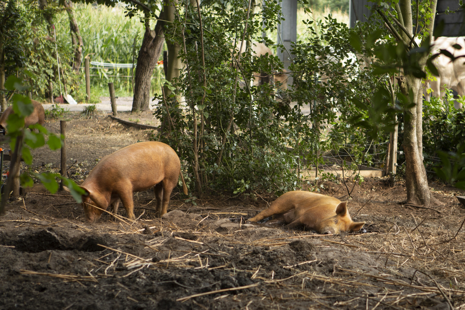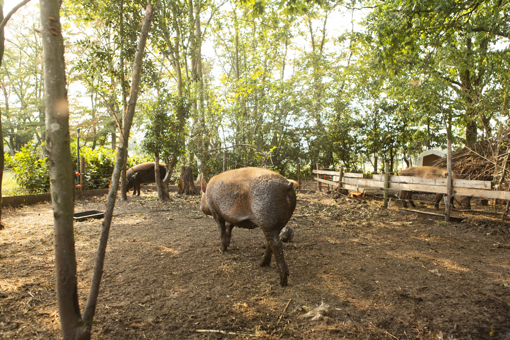 Vleesboerderij Van Trijp in het Brabantse Schijf had oorspronkelijk alleen vleeskoeien; in 2019 zijn daar varkens bij gekomen. De boeren hebben bewust gekozen voor het ras Tamworth: een oud Engels ras, dat afstamt van het Europese wilde zwijn. Tamworths hebben een lange snuit die uitermate geschikt is om allerlei lekkers uit de bodem te halen, van insecten tot wortels, wroeten is voor deze varkens geen probleem! Dit varkensras is robuust en leeft zonder problemen het hele jaar door buiten. Op vleesboerderij Van Trijp worden ze goed verzorgt, ze hebben een buitenplaats tot hun beschikking die bestaat uit bos gemengd met weide. Er zijn bomen om tegenaan te schuren en onder te schuilen en uiteraard is er een modderpoel. De varkens kunnen slapen en schuilen in een hok waar ze een lekker nest van stro hebben. Maar van een dutje in de buitenlucht zijn ze ook niet vies!
