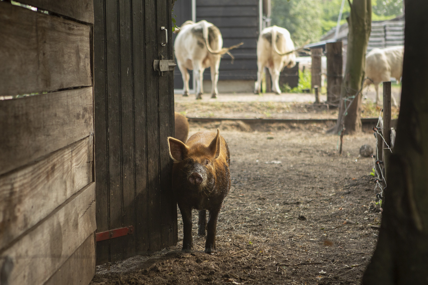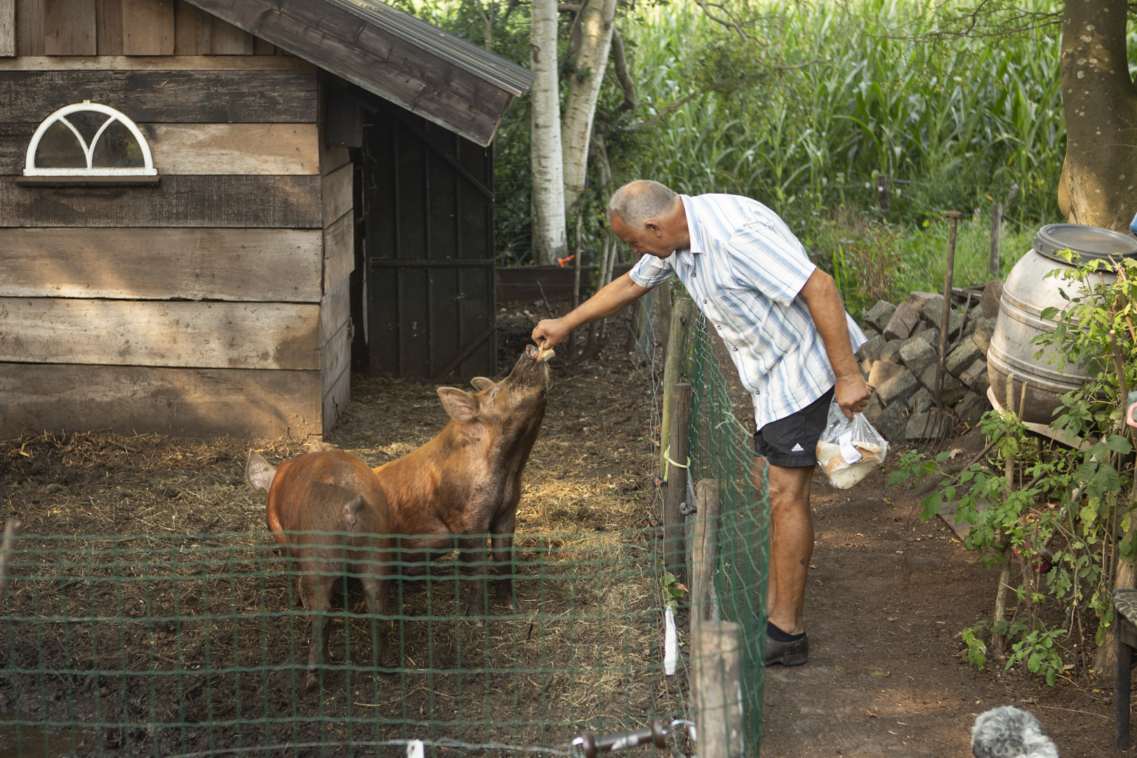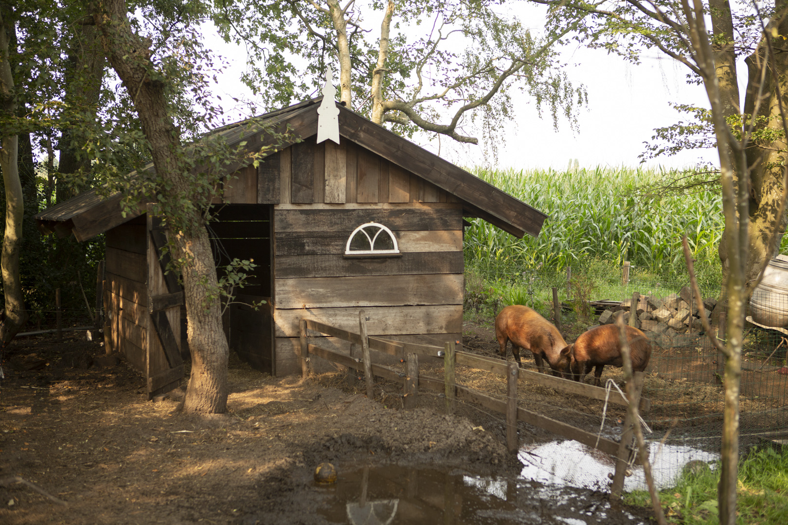 De varkens worden aan huis gehouden, s’avonds doet de boer graag nog even een rondje bij zijn varkens, dan neemt hij een buitenbezem mee en komen de varkens graag even kijken voor een kriebelbeurt met de borstel.