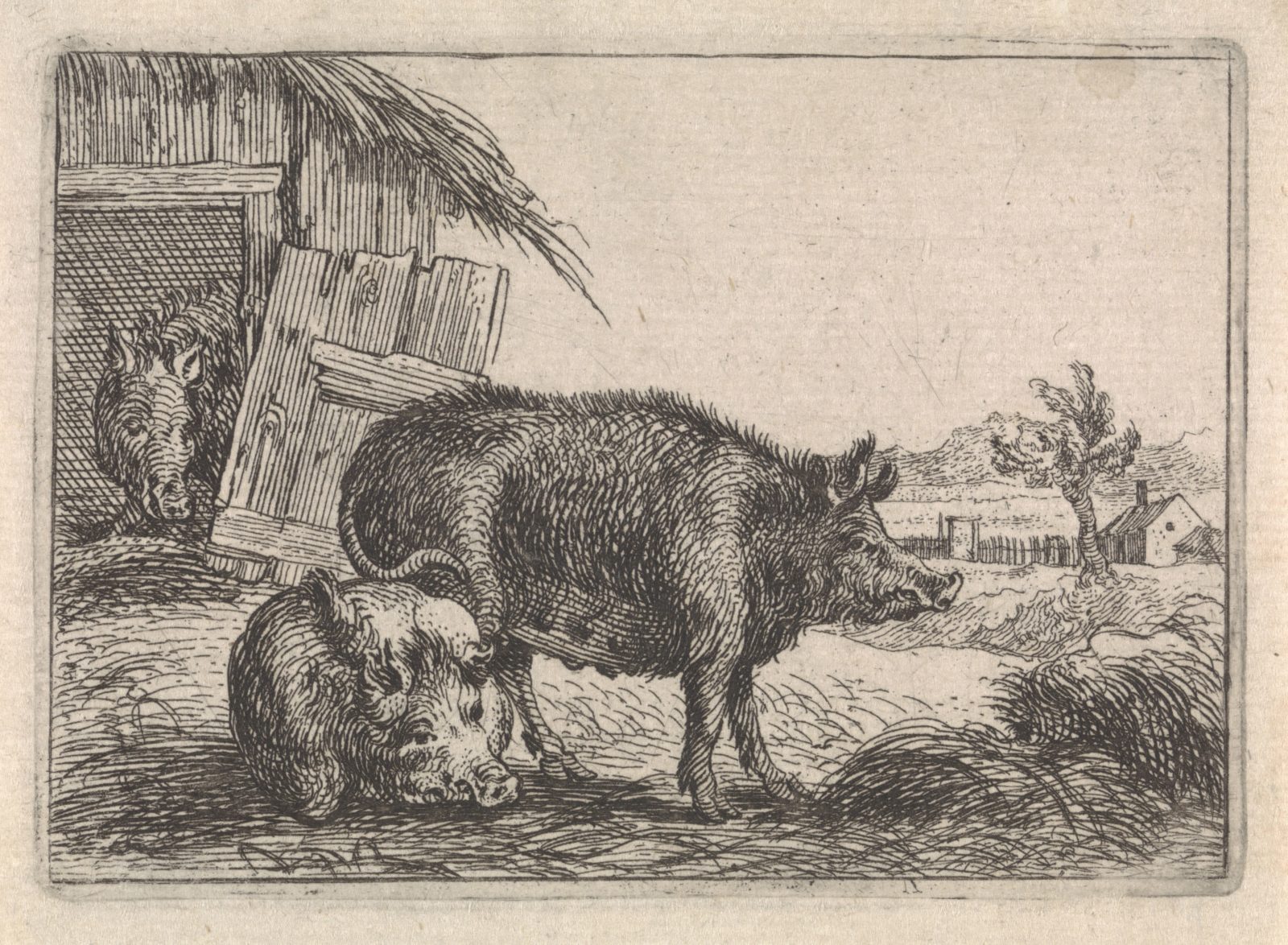 Drie zwijnen bij een stal, Theodorus van Kessel, 1654